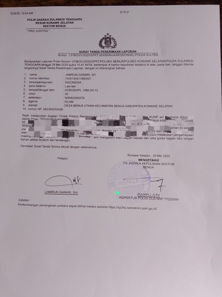 Pengeroyokan dan penganiayaan tersebut korban telah melaporkan kepada pihak berwajib Polsek benua dengan nomor: STBP / 03 / V / 2025 / Sek. Benua.