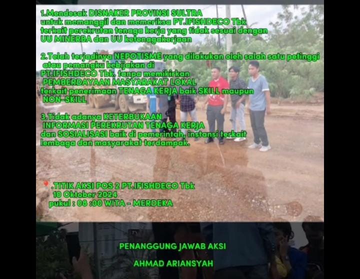 Penanggung jawab Aksi atau Ketua Forum Pemuda Kecamatan Tinanggea FPKT, Ahmad Ariansyah saat dihubungi awak media memaparkan beberapa point tuntutan yang akan disampaikan kepada pihak PT IFISHDECO Kamis 3/01/2024