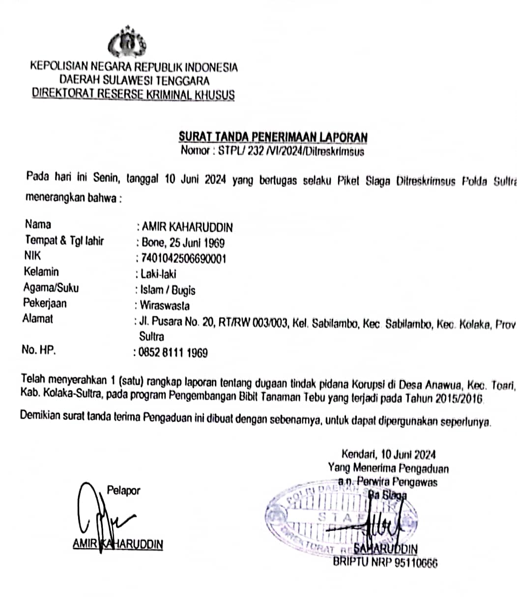 Laporan Dugaan Korupsi Pada Program Pengembangan Tanaman Bibit Tebu Di Desa Anawua Toari Mandek Di Polda Sultra